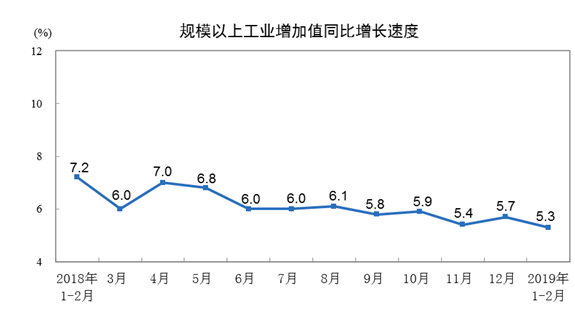 3月14日周四,國(guó)家統(tǒng)計(jì)局發(fā)布數(shù)據(jù)顯示,2019年1-2月份,規(guī)模以上工業(yè)增加值同比實(shí)際增長(zhǎng)5.3 %,不及預(yù)期 5.6%,12月份數(shù)據(jù)為 6.2%。從環(huán)比看,2月份,規(guī)模以上工業(yè)增加值比上月增長(zhǎng)0.43%。