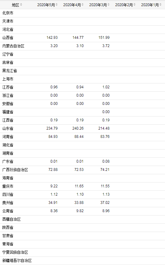 氧化鋁分地區(qū)月度產(chǎn)量(單位:萬噸)