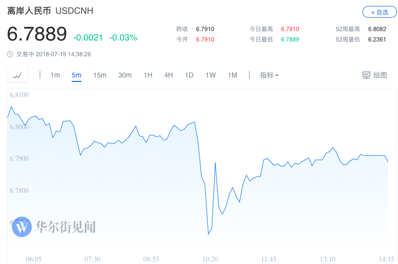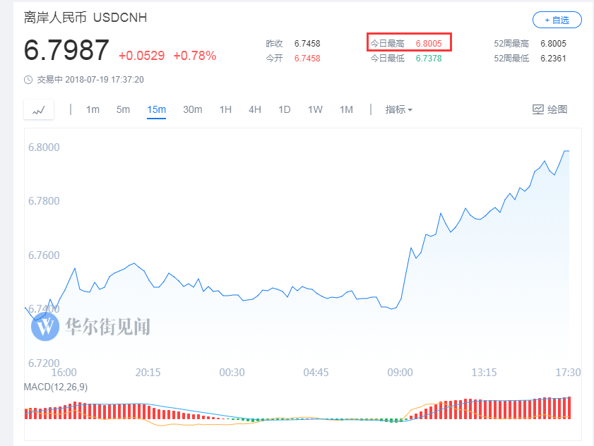 離岸人民幣兌美元在特朗普談及美元之后上揚(yáng)377點,最高觸及6.7641元,短短半小時之內(nèi)相繼收復(fù)6.80、6.79、6.78和6.77。