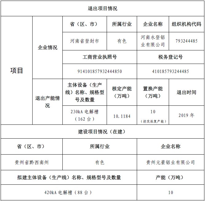 關于貴州元豪鋁業(yè)有限公司煤電鋁一體化項目產(chǎn)能置換方案的公示