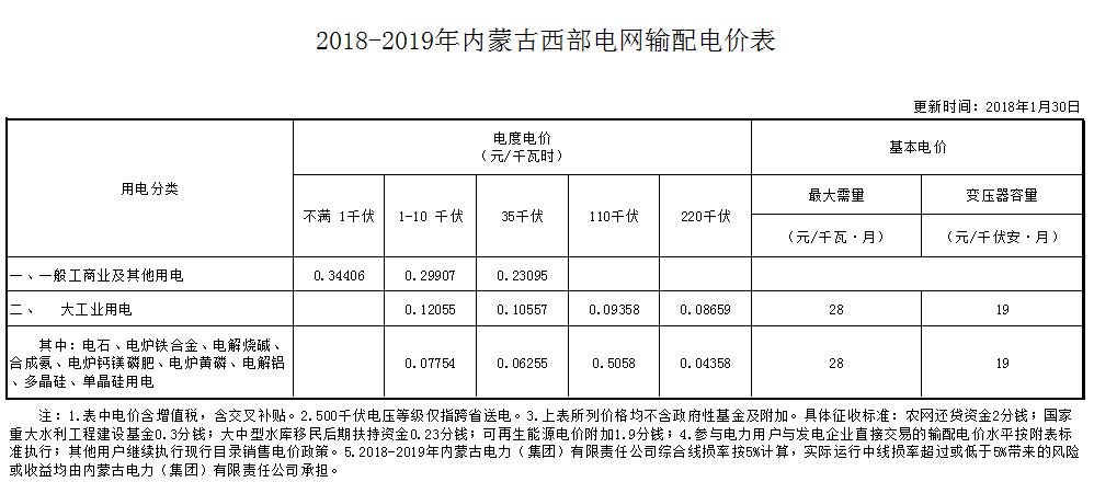 內(nèi)蒙古西部電網(wǎng)銷售電價(jià)表